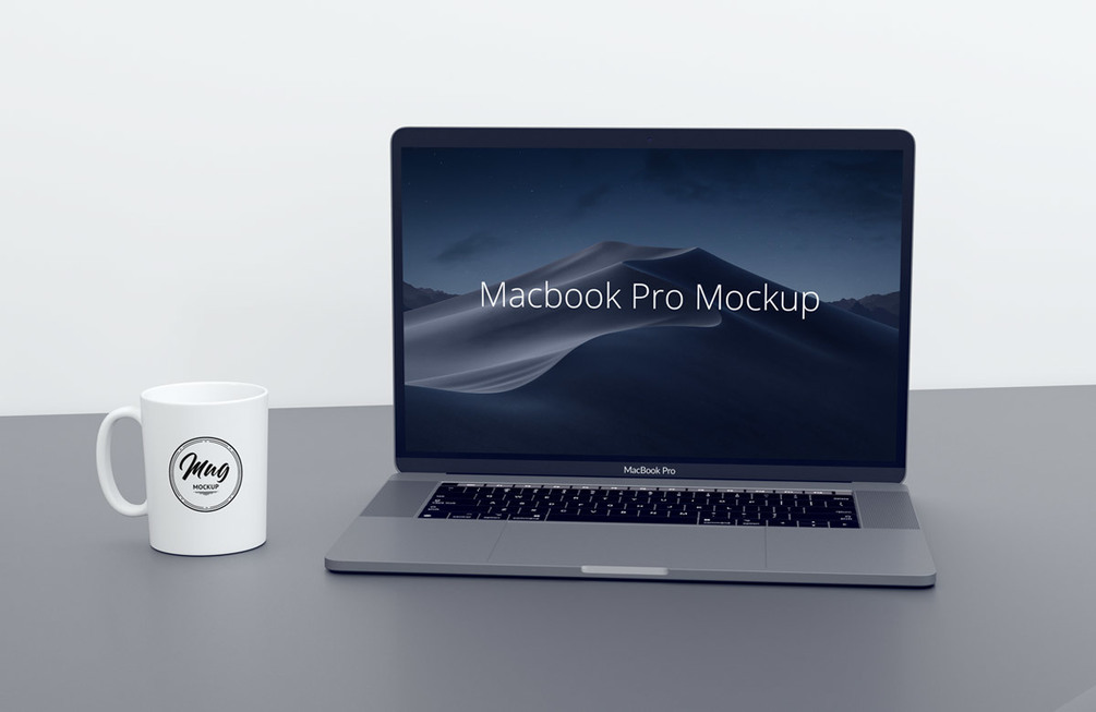 This MacBook Pro Mockup with Coffe Mug it has a high resolution of 5000 x 3000 px.